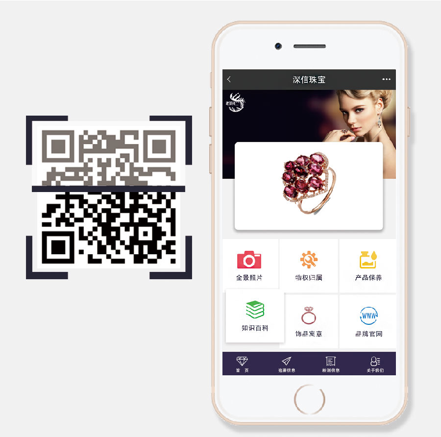 一物一码,存储形式多样化,无论视频、音频、图像、文字均可录入,其存储量是目前防伪工具中容量最大的,能够将产品的各种信息进行存储、展示。如全景(360度)饰品照片、产品保养、物权管理、知识百科、饰品寓意等等信息,均能够通过二维码展示给消费者。