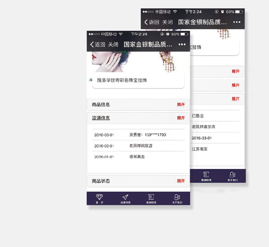 展示企业及首饰的相关信息,介绍企业品牌信息,采集并记录首饰生产环节、流通环节、销售环节、服务等环节。提升品牌可信度。